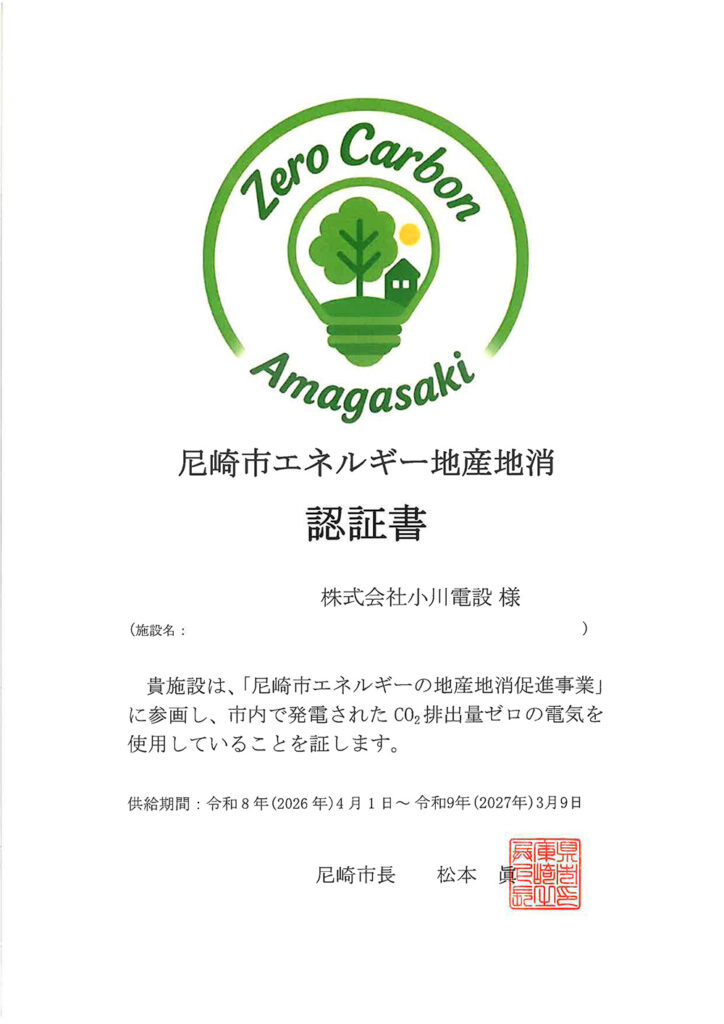 尼崎市エネルギーの地産地消事業参画事業者として認証がおり、市のホームページに掲載されました。