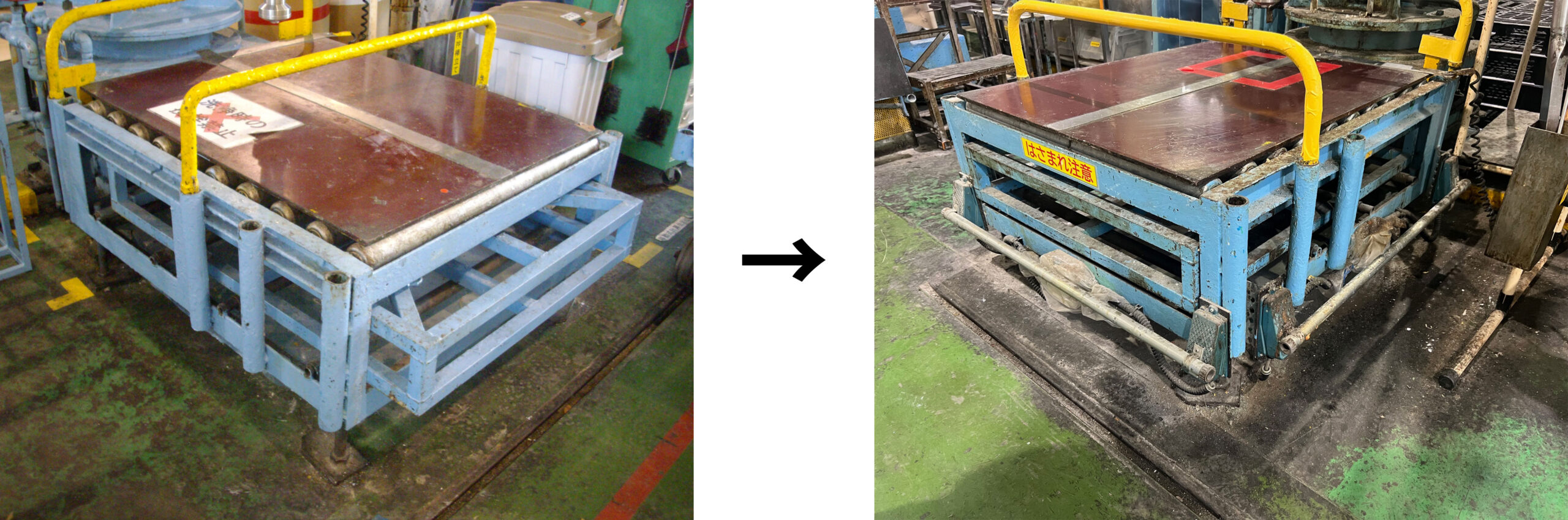 解決策1:容器の在籍確認用の光電センサーを追加し、起動条件(インターロック)とする改造を行い、更に足元に非常停止用バー型スイッチを追加改造を施工しました。